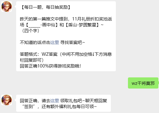 今日问题:昨天的第一篇推文中提到,11月礼册折扣奖池返场【______-画中仙】和【盾山-梦圆繁星】~(四个字)