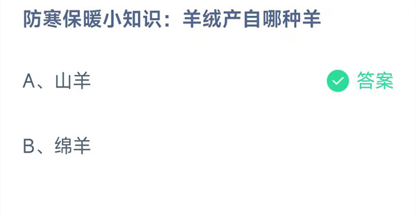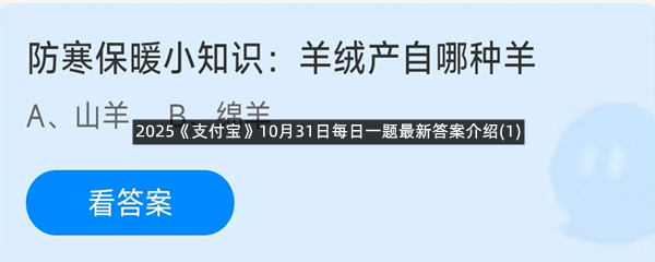 防寒保暖小知识:羊绒产自哪种羊?这是今天《支付宝》每日一题的问题,相信我们很多用户都很想知道这个问题的答案是什么?这么一个可以领取饲料的机会相信我们很多用户都不想错过,这里羊托游小编为你带来了2025《支付宝》10月31日每日一题最新答案介绍(1)的全部内容,喜欢的小伙伴欢迎点击进入看看吧。