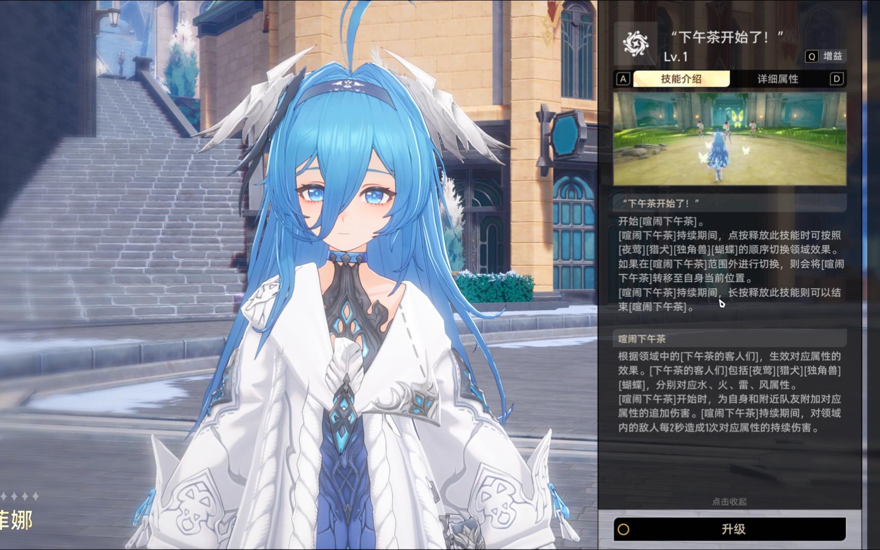 根据领域内的[下午茶的客人们],生效对应属性的增益效果。[下午茶的客人们]包括[夜莺][猎犬][独角兽][瑚渊],分别对应火、雷、风、光属性。在[喧闹下午茶]开始时,为自身和附近队友附加对应属性的追加伤害。在持续期间,对领域内的敌人每2秒造成一次对应属性的持续伤害。