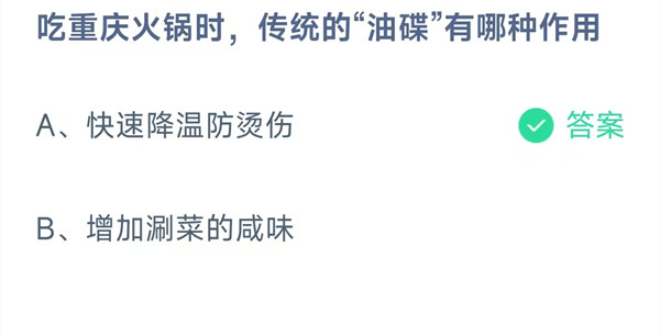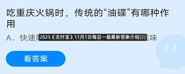 吃重庆火锅时,传统的“油碟”有哪些作用?这是今天《支付宝》每日一题的问题,相信我们很多用户都很想知道这个问题的答案是什么?这么一个可以领取饲料的机会相信我们很多用户都不想错过,这里羊托游小编为你带来了2025《支付宝》11月1日每日一题最新答案介绍(2)的全部内容,喜欢的小伙伴欢迎点击进入看看吧。