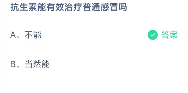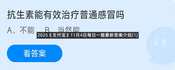 抗生素能有效治疗普通感冒吗?这是今天《支付宝》每日一题的问题,相信我们很多用户都很想知道这个问题的答案是什么?这么一个可以领取饲料的机会相信我们很多用户都不想错过,这里羊托游小编为你带来了2025《支付宝》11月4日每日一题最新答案介绍(1)的全部内容,喜欢的小伙伴欢迎点击进入看看吧。