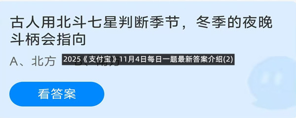 古人用北斗七星判断季节,冬季的夜晚斗柄会指向?这是今天《支付宝》每日一题的问题,相信我们很多用户都很想知道这个问题的答案是什么?这么一个可以领取饲料的机会相信我们很多用户都不想错过,这里羊托游小编为你带来了2025《支付宝》11月4日每日一题最新答案介绍(2)的全部内容,喜欢的小伙伴欢迎点击进入看看吧。
