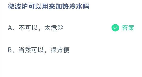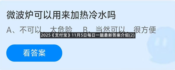 微波炉可以用来加热冷水吗?这是今天《支付宝》每日一题的问题,相信我们很多用户都很想知道这个问题的答案是什么?这么一个可以领取饲料的机会相信我们很多用户都不想错过,这里羊托游小编为你带来了2025《支付宝》11月5日每日一题最新答案介绍(2)的全部内容,喜欢的小伙伴欢迎点击进入看看吧。