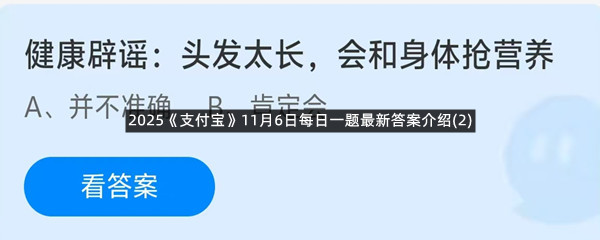 健康辟谣:头发太长,会和身体抢营养?这是今天《支付宝》每日一题的问题,相信我们很多用户都很想知道这个问题的答案是什么?这么一个可以领取饲料的机会相信我们很多用户都不想错过,这里羊托游小编为你带来了2025《支付宝》11月6日每日一题最新答案介绍(2)的全部内容,喜欢的小伙伴欢迎点击进入看看吧。