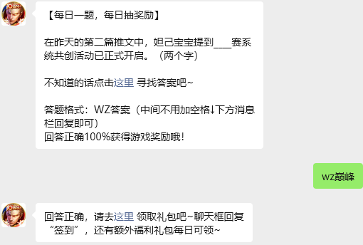 今日问题:在昨天的第二篇推文中,妲己宝宝提到____赛系统共创活动已正式开启。(两个字)