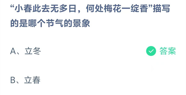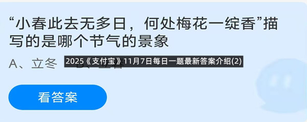 “小春此去无多日,何处梅花一绽香”描写的是哪个节气的景象?这是今天《支付宝》每日一题的问题,相信我们很多用户都很想知道这个问题的答案是什么?这么一个可以领取饲料的机会相信我们很多用户都不想错过,这里羊托游小编为你带来了2025《支付宝》11月7日每日一题最新答案介绍(2)的全部内容,喜欢的小伙伴欢迎点击进入看看吧。