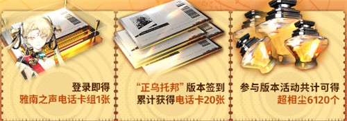 登录游戏即可获得“雅南之声”电话卡组1张;“正乌托邦”版本签到累计可获得电话卡20张;参与版本活动共计可获得超相尘6120个。