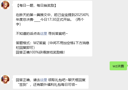今日问题:在昨天的第一篇推文中,妲己宝宝提到2025KPL年度总决赛·____今日17:30正式开始。(两个字)