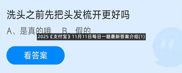 洗头之前先把头发梳开更好吗?这是今天《支付宝》每日一题的问题,相信我们很多用户都很想知道这个问题的答案是什么?这么一个可以领取饲料的机会相信我们很多用户都不想错过,这里羊托游小编为你带来了2025《支付宝》11月11日每日一题最新答案介绍(1)的全部内容,喜欢的小伙伴欢迎点击进入看看吧。
