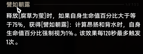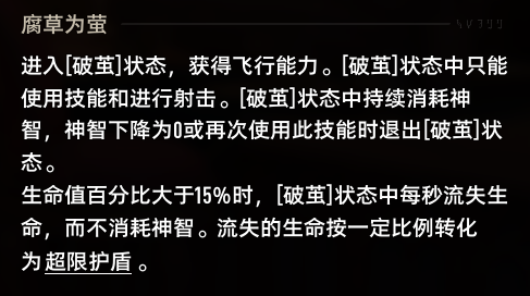 大招期间会持续消耗生命值(每秒5%),当生命低于15%时改为消耗神智值,因此赛琪非常依赖持续回血手段,尽量避免大招期间消耗神智,因为神智是用来释放E技能的。大招输出与角色本体及同律武器相关,此时所带的近战和远程武器只会受到武器技能加成,面板属性不会生效。因此除了携带专属武器外,可以带一把技能能够加成到远程武器的武器,例如双枪“赘生”(技能威力+24%)、手枪“剥离”(角色攻击+60%),无需培养,带上即可。