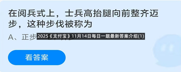 在阅兵式上,士兵高抬腿向前整齐迈步,这种步伐被称为?这是今天《支付宝》每日一题的问题,相信我们很多用户都很想知道这个问题的答案是什么?这么一个可以领取饲料的机会相信我们很多用户都不想错过,这里羊托游小编为你带来了2025《支付宝》11月14日每日一题最新答案介绍(1)的全部内容,喜欢的小伙伴欢迎点击进入看看吧。