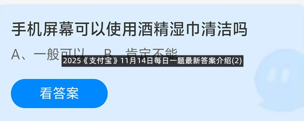 手机屏幕可以使用酒精湿巾清洁吗?这是今天《支付宝》每日一题的问题,相信我们很多用户都很想知道这个问题的答案是什么?这么一个可以领取饲料的机会相信我们很多用户都不想错过,这里羊托游小编为你带来了2025《支付宝》11月14日每日一题最新答案介绍(2)的全部内容,喜欢的小伙伴欢迎点击进入看看吧。