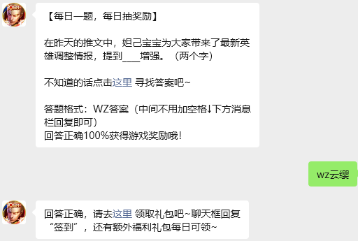 今日问题:在昨天的推文中,妲己宝宝为大家带来了最新英雄调整情报,提到____增强。(两个字)