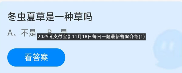 冬虫夏草是一种草吗?这是今天《支付宝》每日一题的问题,相信我们很多用户都很想知道这个问题的答案是什么?这么一个可以领取饲料的机会相信我们很多用户都不想错过,这里羊托游小编为你带来了2025《支付宝》11月18日每日一题最新答案介绍(1)的全部内容,喜欢的小伙伴欢迎点击进入看看吧。