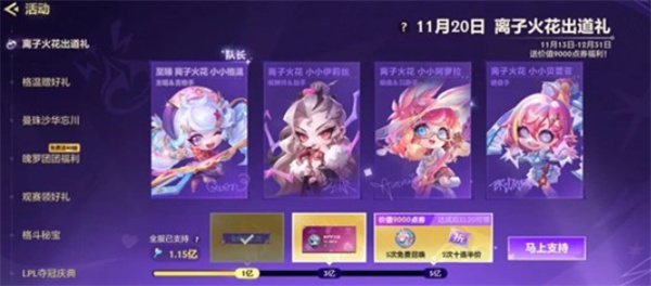 本次活动以“离子火花粉丝回馈”为主题,全服玩家的支持进度会被累计统计。当全服支持值达到预设目标时,就可以解锁丰厚的出道礼包,其中包括价值9000点券的超值福利。