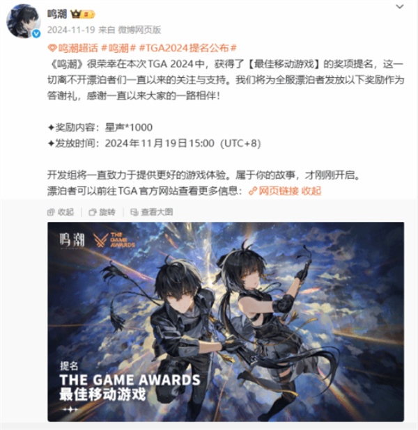 回顾去年,《鸣潮》在首次入围时,全服发放了1000星声来庆祝。虽然最终未能拿下奖项(当届最佳手游由《小丑牌》获得),官方仍额外补发了800星声,展现了十足的诚意。