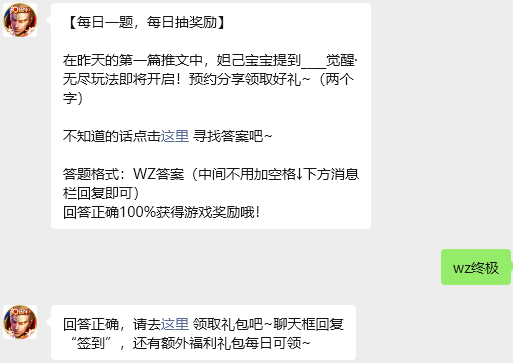 今日问题:在昨天的第一篇推文中,妲己宝宝提到____觉醒·无尽玩法即将开启!预约分享领取好礼~(两个字)
