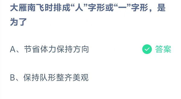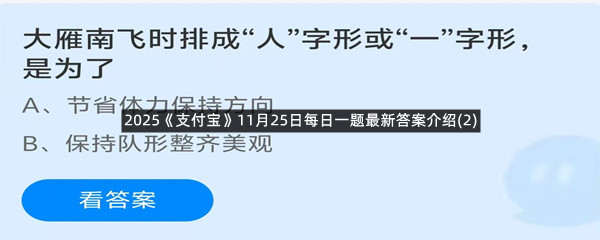 大雁南飞时排成“人”字形或“一”字形,是为了?这是今天《支付宝》每日一题的问题,相信我们很多用户都很想知道这个问题的答案是什么?这么一个可以领取饲料的机会相信我们很多用户都不想错过,这里羊托游小编为你带来了2025《支付宝》11月25日每日一题最新答案介绍(2)的全部内容,喜欢的小伙伴欢迎点击进入看看吧。