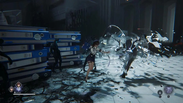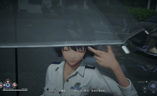 玩法演示主要呈现三大核心内容:其一为战斗系统,延续三人小队切换操作模式,角色可使用雨伞、文件夹等特殊武器作战,同时融合潜行处决机制与华丽技能特效演出;