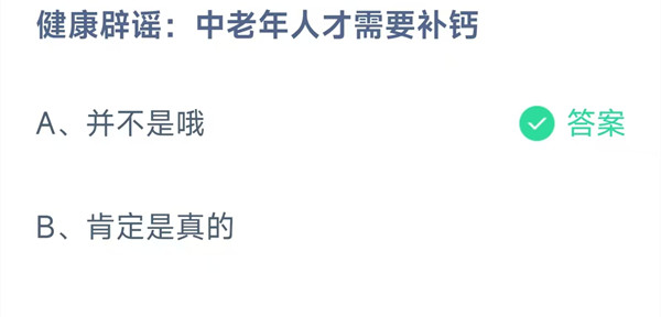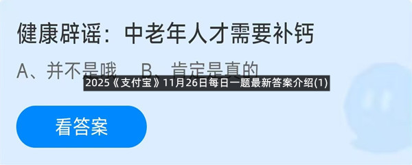 健康辟谣:中老年人才需要补钙?这是今天《支付宝》每日一题的问题,相信我们很多用户都很想知道这个问题的答案是什么?这么一个可以领取饲料的机会相信我们很多用户都不想错过,这里羊托游小编为你带来了2025《支付宝》11月26日每日一题最新答案介绍(1)的全部内容,喜欢的小伙伴欢迎点击进入看看吧。