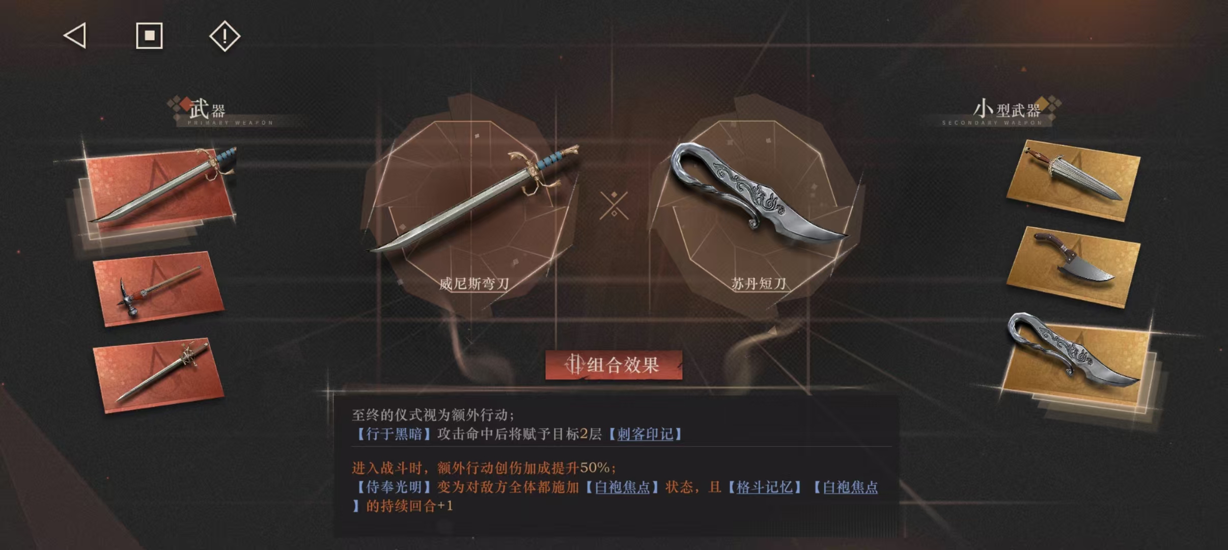 武器选择:主武器推荐威尼斯弯刀,副武器可选清杂用屠刀;如果生存压力不大,可以使用短刀,高压环境下则优先选择五指剑