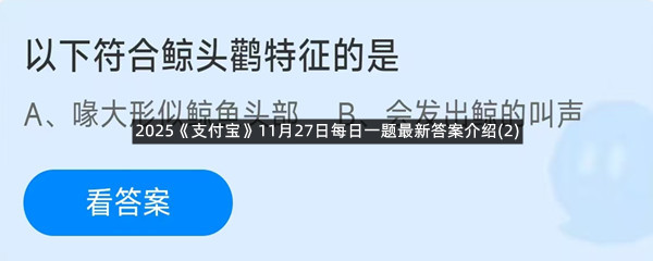 以下符合鲸头鹳特征的是?这是今天《支付宝》每日一题的问题,相信我们很多用户都很想知道这个问题的答案是什么?这么一个可以领取饲料的机会相信我们很多用户都不想错过,这里羊托游小编为你带来了2025《支付宝》11月27日每日一题最新答案介绍(2)的全部内容,喜欢的小伙伴欢迎点击进入看看吧。