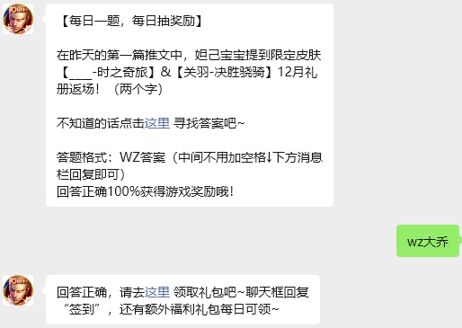 今日问题:在昨天的第一篇推文中,妲己宝宝提到限定皮肤【____-时之奇旅】&【关羽-决胜骁骑】12月礼册返场!(两个字)
