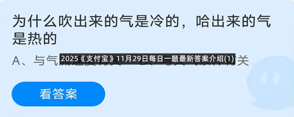 为什么吹出来的气是冷的,哈出来的气是热的?这是今天《支付宝》每日一题的问题,相信我们很多用户都很想知道这个问题的答案是什么?这么一个可以领取饲料的机会相信我们很多用户都不想错过,这里羊托游小编为你带来了2025《支付宝》11月29日每日一题最新答案介绍(1)的全部内容,喜欢的小伙伴欢迎点击进入看看吧。