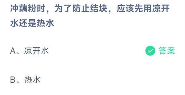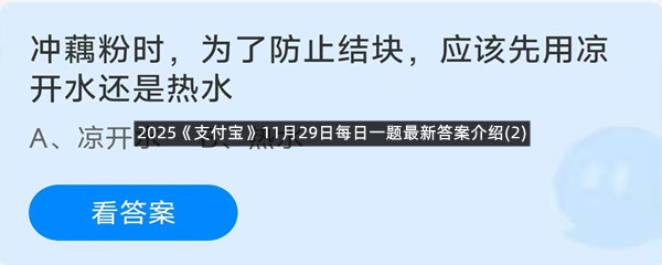 冲藕粉时,为了防止结块,应该先用凉开水还是热水?这是今天《支付宝》每日一题的问题,相信我们很多用户都很想知道这个问题的答案是什么?这么一个可以领取饲料的机会相信我们很多用户都不想错过,这里羊托游小编为你带来了2025《支付宝》11月29日每日一题最新答案介绍(2)的全部内容,喜欢的小伙伴欢迎点击进入看看吧。