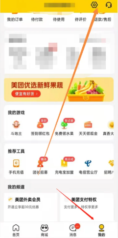 1、首先打开美团进入主页,点击右下角的【我的】,然后在右上角找到并点击【设置】按钮;