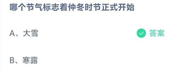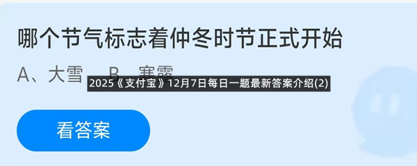 哪个节气标志着仲冬时节正式开始?这是今天《支付宝》每日一题的问题,相信我们很多用户都很想知道这个问题的答案是什么?这么一个可以领取饲料的机会相信我们很多用户都不想错过,这里羊托游小编为你带来了2025《支付宝》12月7日每日一题最新答案介绍(2)的全部内容,喜欢的小伙伴欢迎点击进入看看吧。