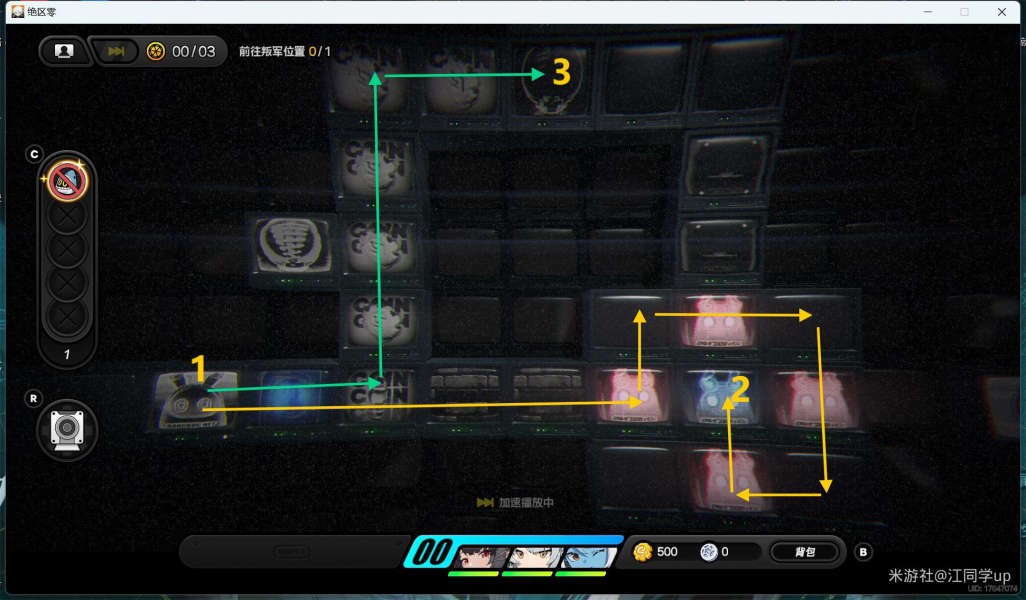 (2)到达1区域后,按R键进入【夜视模式】(夜视模式可以看到隐藏路线,可击打红色和蓝色怪物,并可穿墙;攻略中部分地方会用夜视模式展示路线,玩家只需在击打红色或蓝色怪物时开启,正常行走则可退出夜视模式)。随后前往2区域,先清理2区域四周的4个红色怪物,然后进入2区域内部,并在2区域按R键退出夜视模式,这样会自动返回1区域。接着前往上方的3区域。