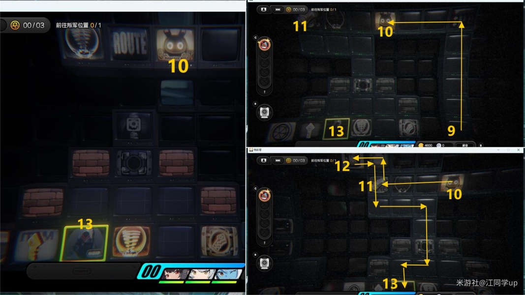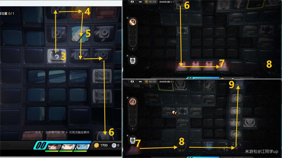 (3)接着依次前往4和5区域,然后前往下方的6区域,在6区域按R键进入夜视模式,击败下方4个红色怪物后,再到7区域按R键退出夜视模式,这样会自动返回6区域。随后前往下方的8区域,在8区域再次按R键进入夜视模式,击败9区域的蓝色怪物后退出夜视模式,然后进入9区域。