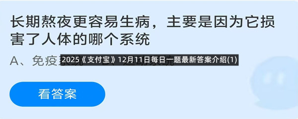 长期熬夜更容易生病,主要是因为它损害了人体的哪个系统?这是今天《支付宝》每日一题的问题,相信我们很多用户都很想知道这个问题的答案是什么?这么一个可以领取饲料的机会相信我们很多用户都不想错过,这里羊托游小编为你带来了2025《支付宝》12月11日每日一题最新答案介绍(1)的全部内容,喜欢的小伙伴欢迎点击进入看看吧。