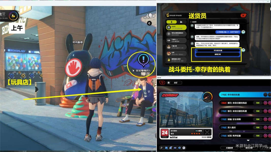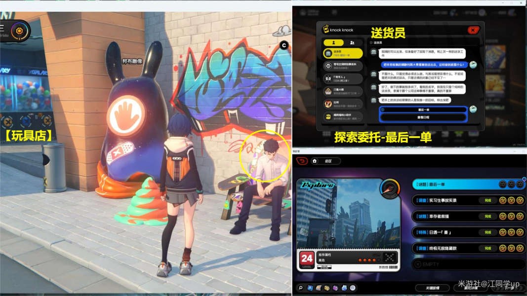 (4)完成第2个前置任务【战斗委托-幸存者执着】后,再次传送至【玩具店】下图位置,与【犹犹豫豫的人】对话,将再次收到【送货员】的短信。阅读短信后,即可接取本次的主要任务【探索委托-最后一单】。
