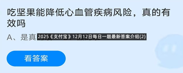 吃坚果能降低心血管疾病风险,真的有效吗?这是今天《支付宝》每日一题的问题,相信我们很多用户都很想知道这个问题的答案是什么?这么一个可以领取饲料的机会相信我们很多用户都不想错过,这里羊托游小编为你带来了2025《支付宝》12月12日每日一题最新答案介绍(2)的全部内容,喜欢的小伙伴欢迎点击进入看看吧。