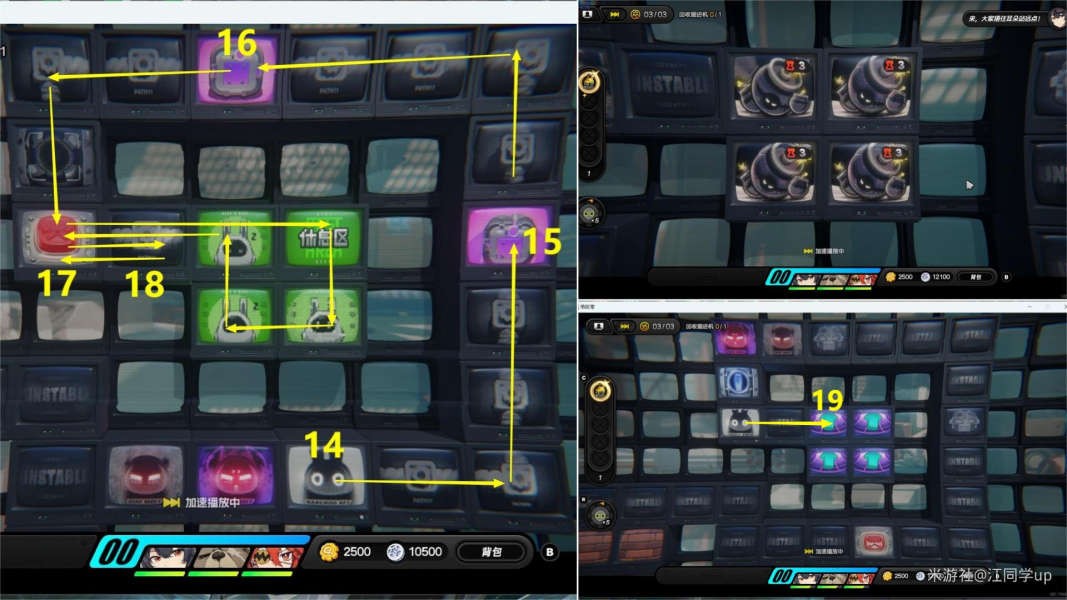 (6)然后依次前往15-18区域,再绕4个休息区域转一圈,在17和18区域来回走动几次后,4个休息区域会出现4个炸弹,随后前往新出现的19区域进行传送。