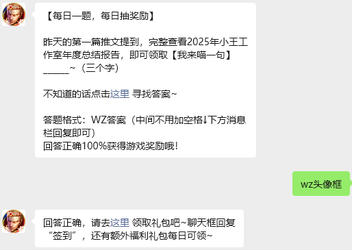 今日问题:昨天的第一篇推文提到,完整查看2025年小王工作室年度总结报告,即可领取【我来喵一句】______~(三个字)