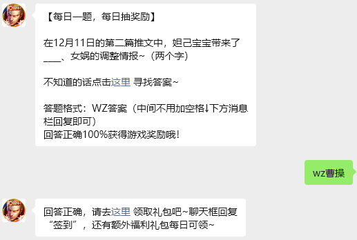 今日问题:在12月11日的第二篇推文中,妲己宝宝带来了____、女娲的调整情报~(两个字)