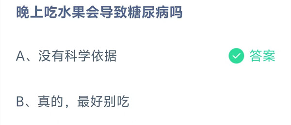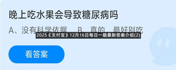 晚上吃水果会导致糖尿病吗?这是今天《支付宝》每日一题的问题,相信我们很多用户都很想知道这个问题的答案是什么?这么一个可以领取饲料的机会相信我们很多用户都不想错过,这里羊托游小编为你带来了2025《支付宝》12月16日每日一题最新答案介绍(2)的全部内容,喜欢的小伙伴欢迎点击进入看看吧。