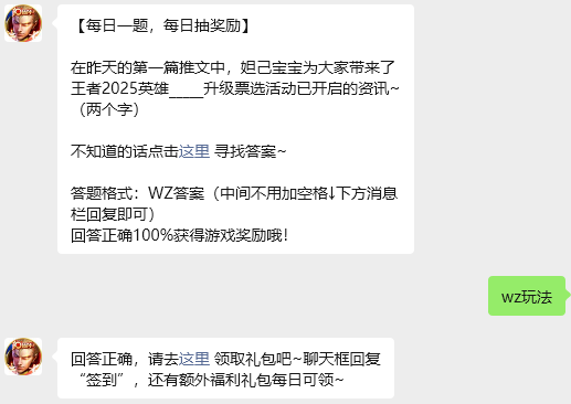 今日问题:在昨天的第一篇推文中,妲己宝宝为大家带来了王者2025英雄_____升级票选活动已开启的资讯~(两个字)