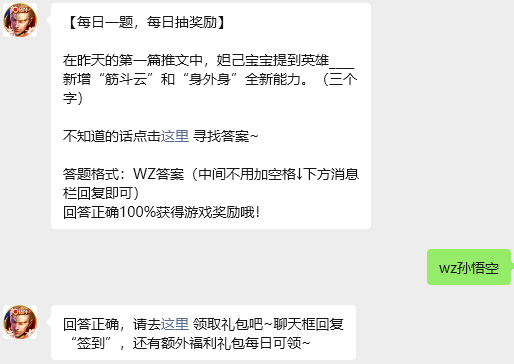 今日问题:在昨天的第一篇推文中,妲己宝宝提到英雄____新增“筋斗云”和“身外身”全新能力。(三个字)