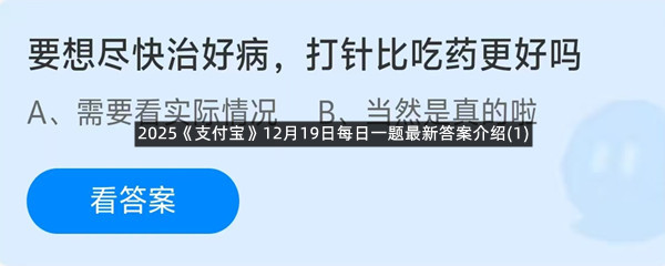 要想尽快治好病,打针比吃药更好吗?这是今天《支付宝》每日一题的问题,相信我们很多用户都很想知道这个问题的答案是什么?这么一个可以领取饲料的机会相信我们很多用户都不想错过,这里羊托游小编为你带来了2025《支付宝》12月19日每日一题最新答案介绍(1)的全部内容,喜欢的小伙伴欢迎点击进入看看吧。