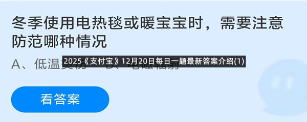 冬季使用电热毯或暖宝宝时,需要注意防范哪种情况?这是今天《支付宝》每日一题的问题,相信我们很多用户都很想知道这个问题的答案是什么?这么一个可以领取饲料的机会相信我们很多用户都不想错过,这里羊托游小编为你带来了2025《支付宝》12月20日每日一题最新答案介绍(1)的全部内容,喜欢的小伙伴欢迎点击进入看看吧。
