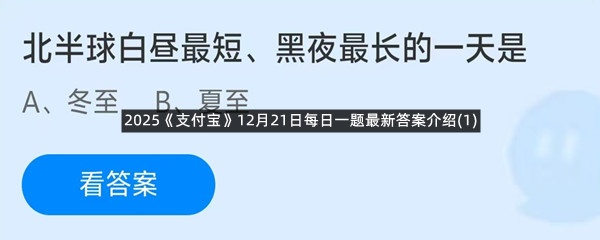 北半球白昼最短、黑夜最长的一天是?这是今天《支付宝》每日一题的问题,相信我们很多用户都很想知道这个问题的答案是什么?这么一个可以领取饲料的机会相信我们很多用户都不想错过,这里羊托游小编为你带来了2025《支付宝》12月21日每日一题最新答案介绍(1)的全部内容,喜欢的小伙伴欢迎点击进入看看吧。