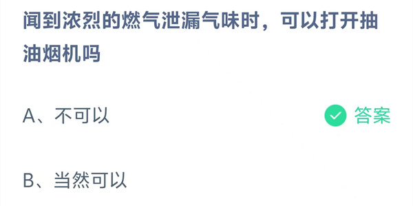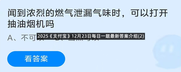 闻到浓烈的燃气泄漏气味时,可以打开抽油烟机吗?这是今天《支付宝》每日一题的问题,相信我们很多用户都很想知道这个问题的答案是什么?这么一个可以领取饲料的机会相信我们很多用户都不想错过,这里羊托游小编为你带来了2025《支付宝》12月23日每日一题最新答案介绍(2)的全部内容,喜欢的小伙伴欢迎点击进入看看吧。