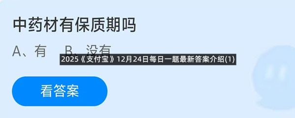 中药材有保质期吗?这是今天《支付宝》每日一题的问题,相信我们很多用户都很想知道这个问题的答案是什么?这么一个可以领取饲料的机会相信我们很多用户都不想错过,这里羊托游小编为你带来了2025《支付宝》12月24日每日一题最新答案介绍(1)的全部内容,喜欢的小伙伴欢迎点击进入看看吧。