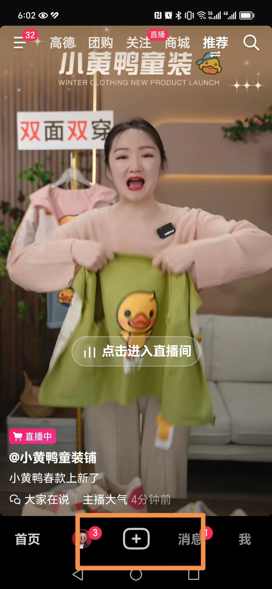 1、打开抖音APP,在首页点击中间的“+”图标进入拍摄页面。