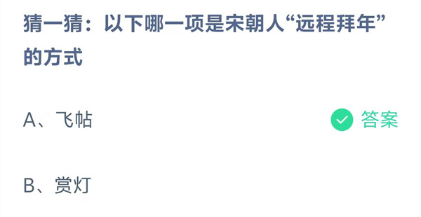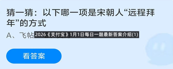 猜一猜:以下哪一项是宋朝人“远程拜年”的方式?这是今天《支付宝》每日一题的问题,相信我们很多用户都很想知道这个问题的答案是什么?这么一个可以领取饲料的机会相信我们很多用户都不想错过,这里羊托游小编为你带来了2026《支付宝》1月1日每日一题最新答案介绍(1)的全部内容,喜欢的小伙伴欢迎点击进入看看吧。