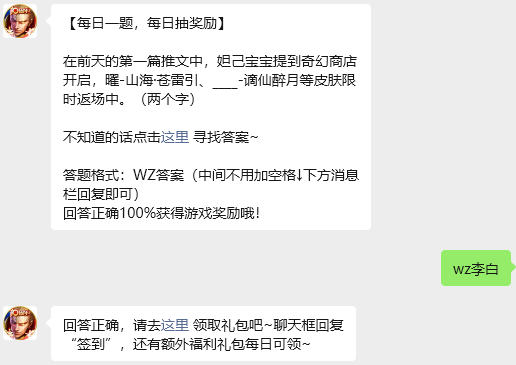 今日问题:在前天的第一篇推文中,妲己宝宝提到奇幻商店开启,曜-山海·苍雷引、____-谪仙醉月等皮肤限时返场中。(两个字)